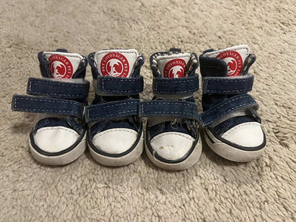 We first got him a set of boots last winter because concrete must be very cold for his little paws, and to protect him from yucky things such as salt on the street. He loves wearing shoes. He wears boots during winter, and he has another set of sneakers for summer. This is his winter boots purchased via Amazon.