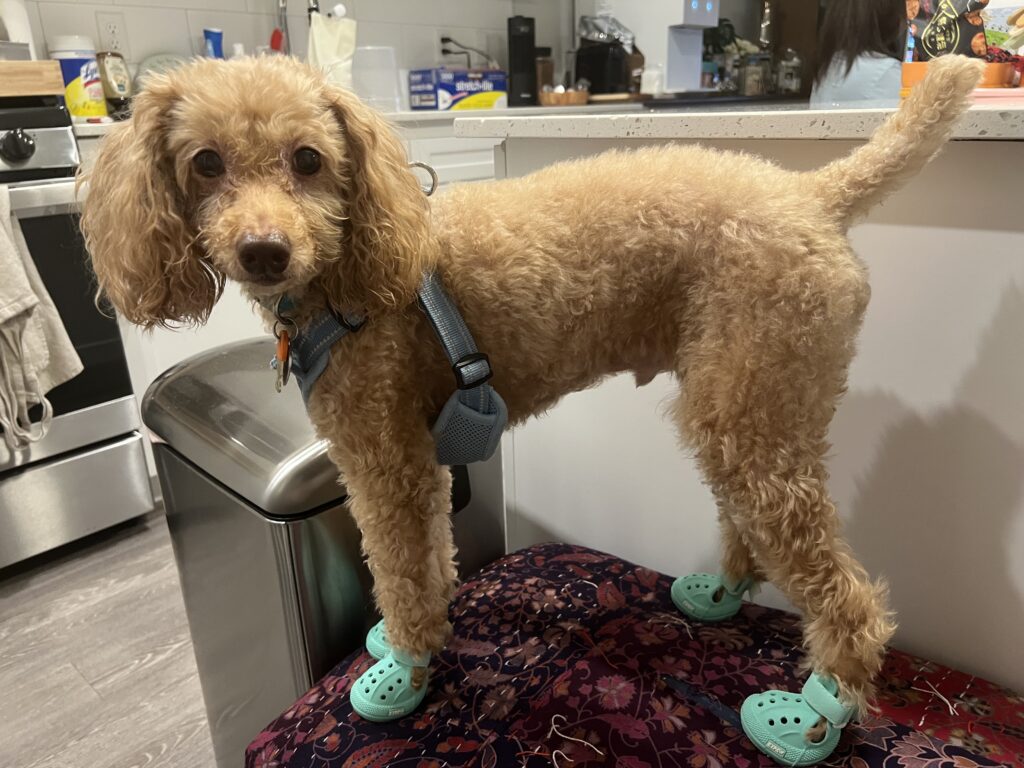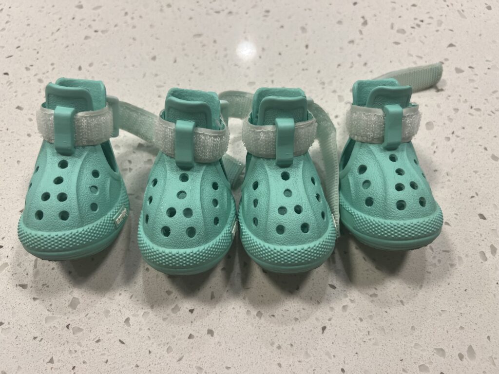 There are advantages for dogs to wear Crocks, especially during summer. It was a very similar feeling to my own human experience; it dries up quickly when you step into water, but it is yucky when the sand comes in. Also, wearing Crocks for a long time makes your feet sweat. Another benefit of wearing Crocks indoor – paws get extra traction to the floor. Sachi’s leg was injured this summer, so we had him wear Crocks in the room for a few weeks. I highly recommend Crocks for dogs.